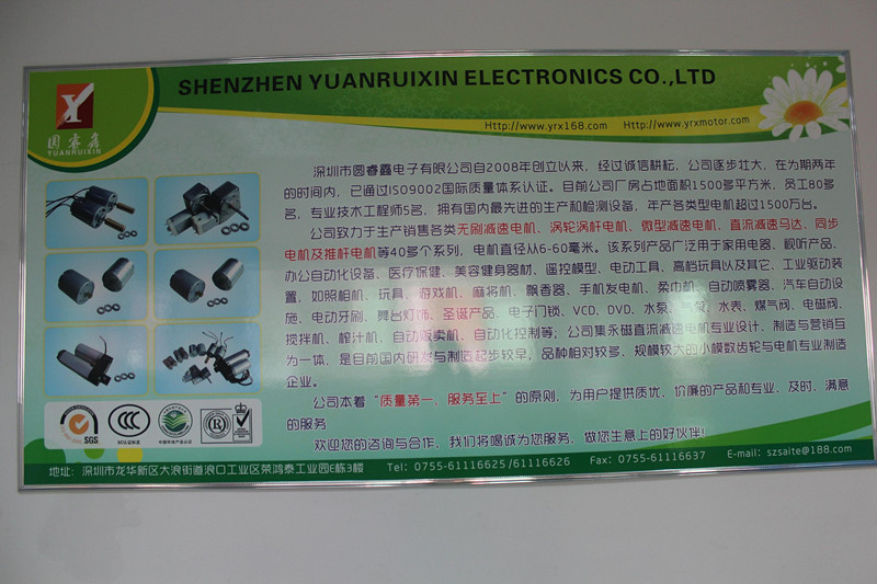 深圳市圓睿鑫電子有限公司自2008年創(chuàng)立以來(lái),經(jīng)過(guò)誠(chéng)信耕耘,在為期兩年的時(shí)間內(nèi),已通過(guò)ISO9001:2000國(guó)際質(zhì)量體系認(rèn)證。公司廠房占地面積2000多平方米,員工100人,專業(yè)技術(shù)工程師6名,擁有國(guó)內(nèi)最先進(jìn)的生產(chǎn)和檢測(cè)設(shè)備,年產(chǎn)各類減速電機(jī)超過(guò)2~300萬(wàn)臺(tái)。因公司發(fā)展需要,于2020年底,將生產(chǎn)基地遷往擁有最美小鎮(zhèn)之稱的東莞市清溪鎮(zhèn),依山傍水,依托美麗的大自然環(huán)境和地方文化,全新的東莞市圓睿鑫電子有限公司將借助深圳母公司平臺(tái),一步步走上新的臺(tái)階。 東莞公司將繼續(xù)致力于生產(chǎn)銷售各類無(wú)刷減速電機(jī) 渦輪渦桿電機(jī),微型減速電機(jī),直流減速馬達(dá),交流手搖發(fā)電機(jī)、同步電機(jī)及空心杯電機(jī)等,電機(jī)直徑從6-60毫米為定位,系列產(chǎn)品廣泛用于智能家電、智能辦公自動(dòng)化設(shè)備、智能醫(yī)療、美容健身器材、遙控模型、電動(dòng)工具、高檔玩具以及其它工業(yè)驅(qū)動(dòng)裝置,如高檔玩具、游戲機(jī)、麻將機(jī)、飄香器、手機(jī)發(fā)電機(jī)、柔巾機(jī)、自動(dòng)噴霧器、汽車(chē)自動(dòng)設(shè)施、電動(dòng)牙刷、舞臺(tái)燈飾、圣誕產(chǎn)品、智能電子門(mén)鎖、VCD、DVD、水泵、氣泵、水表、煤氣閥、電磁閥、攪拌機(jī)、榨汁...